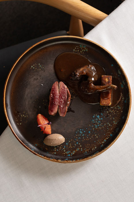 Txerrikume tenperatura baxuan egina, bere saltsa eta patata purea